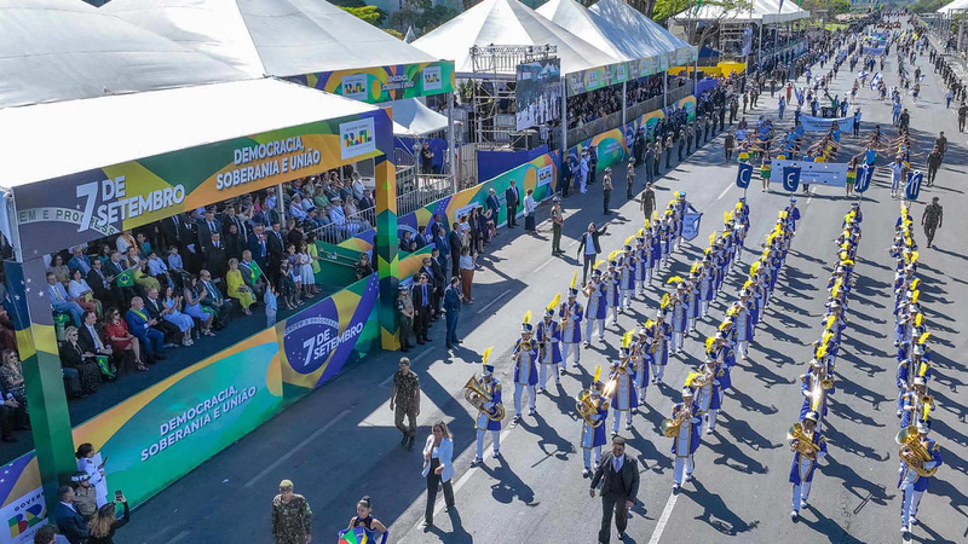 Com a proclamação da República, o 7 de setembro passou a exaltar simbolicamente a Pátria, celebrada, sobretudo, pelos desfiles das Forças Armadas, ainda que acompanhadas, depois da Revolução de 30, por desfiles estudantis. Era o reflexo do trânsito do antigo Poder Moderador do Imperador para uma nova fase de tutela das Forças Armadas na nossa vida pública. O bacharelismo dos punhos de renda, dos filhos da aristocracia escravocrata começava a ceder lugar – mesmo sob o retrocesso oligárquico do “Café com Leite” entre a saída de Floriano Peixoto e a Revolução de 1930 – aos arquitetos da modernidade industrial, cujo grande símbolo, aliás, foi a “Marcha para o Oeste”, na qual a construção de Brasília ocupa lugar destacado. No começo deste longo período, República Velha, vez que a ela sucede-se a Era Varguista que se prolonga sob várias roupagens até 1979, emergem quadros e dicções que nem sempre correspondem ao que realmente ocorreu na Independência. Foi o resultado do positivismo mais afeito à valorização dos fatos do que aos processos: “Ordem e Progresso”.
