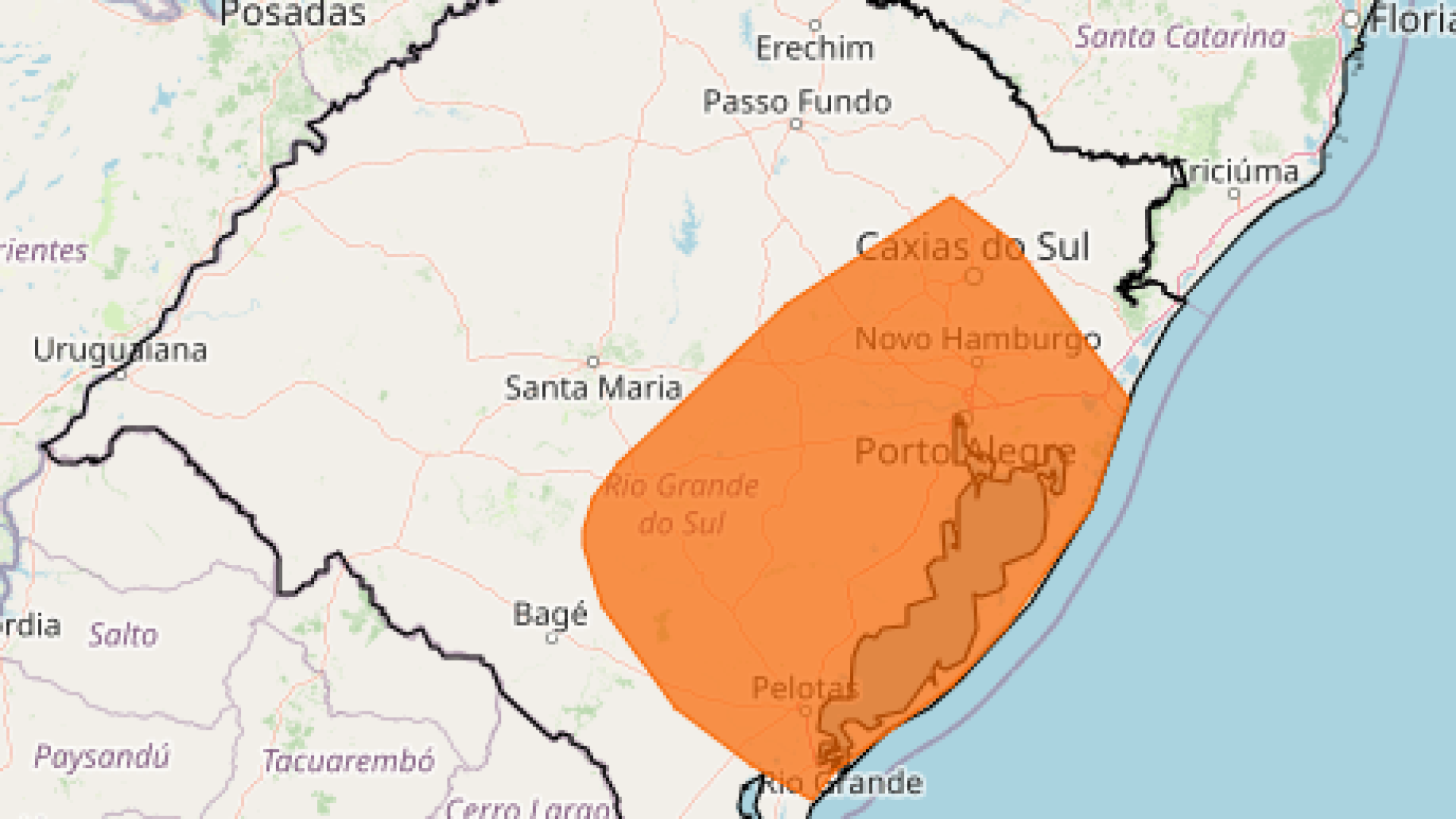 O alerta de temporal acompanhado de descargas elétricas, eventual queda granizo e rajadas de vento é até 20h desta quarta-feira. O órgão alertou para inundação dos rios Guaíba, Ibirapuitã, Uruguai, Camaquã, Santa Maria, Jaguarão e Piratini e dos Arroios São Lourenço e Caraá. Também foram emitidos avisos de cheia do rio Jacuí e Vacacaí e afluentes.
