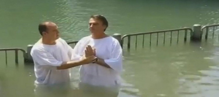 - O batismo no rio Jordão (2016) – realizado por um pastor evangélico em Israel, em plena crise do governo Dilma. O ato, filmado e amplamente difundido, associa Bolsonaro diretamente à simbologia bíblica do renascimento espiritual e da missão divina, aproximando-o do eleitorado evangélico e conferindo-lhe o estatuto de “candidato híbrido” (católico e evangélico ao mesmo tempo).
