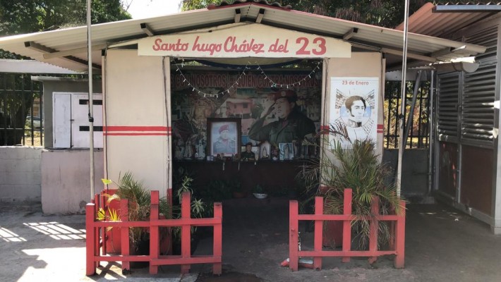 - erguem-se capelas, como a dedicada a “San Hugo Chávez”, onde sua imagem convive com santos e virgens;