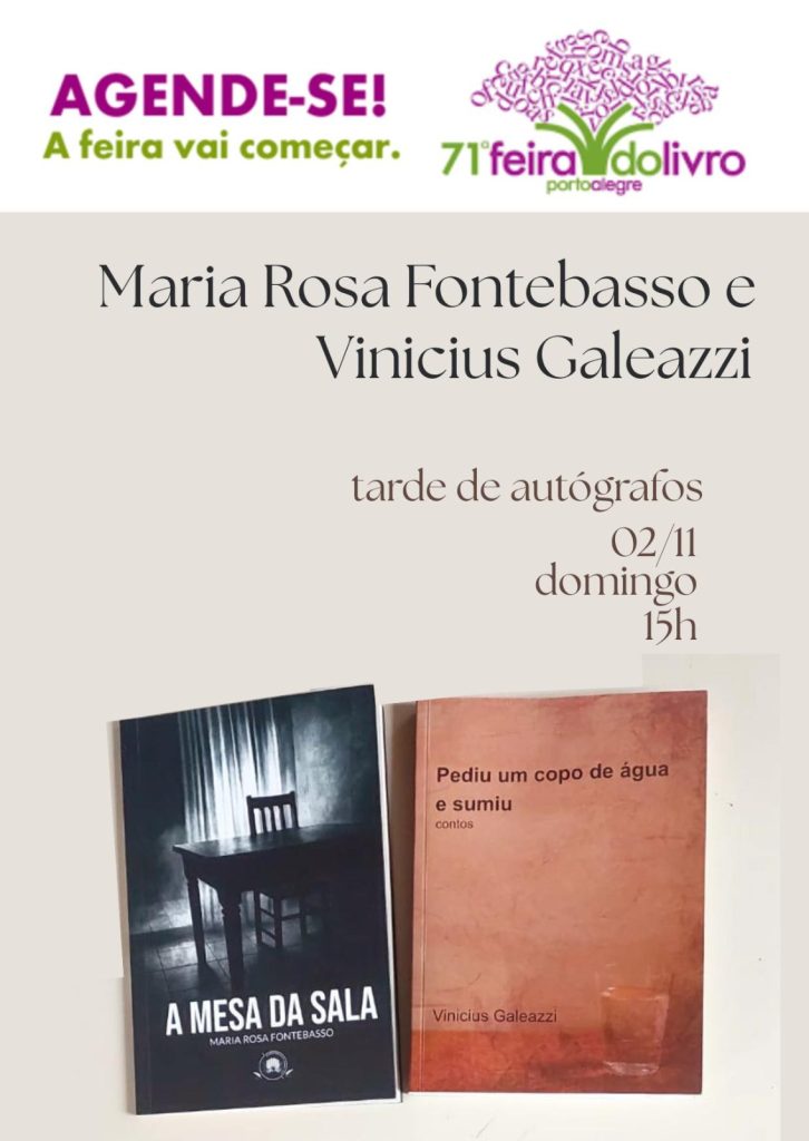 Neste domingo, 02, Maria Rosa Fontebasso lança o livro de contos “A Mesa da Sala”, em tarde de autógrafos que inicia às 15h na Praça de Autógrafos Maurício Sirotsky Sobrinho, ao lado de Vinicius Galeazzi que lança “Pediu um copo de água e sumiu”.
