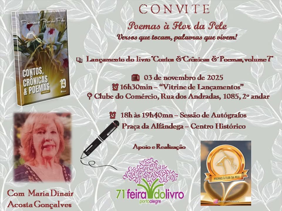 Já na segunda-feira, 03, será a vez de Maria Dinair Acosta Gonçalves apresentar a publicação de qual é coautora – “Contos & crônicas & poemas, volume 7”. O livro é constituído de textos elaborados por um coletivo de 83 escritores que revelam seu interior poético buscando encantar os leitores com suas palavras de carinho. Às 16h30 a obra será apresentada na Vitrine de Talentos, localizada no 2º andar do Clube do Comércio. E às 18h inicia a sessão de autógrafos, na Praça de Autógrafos Coletivos.