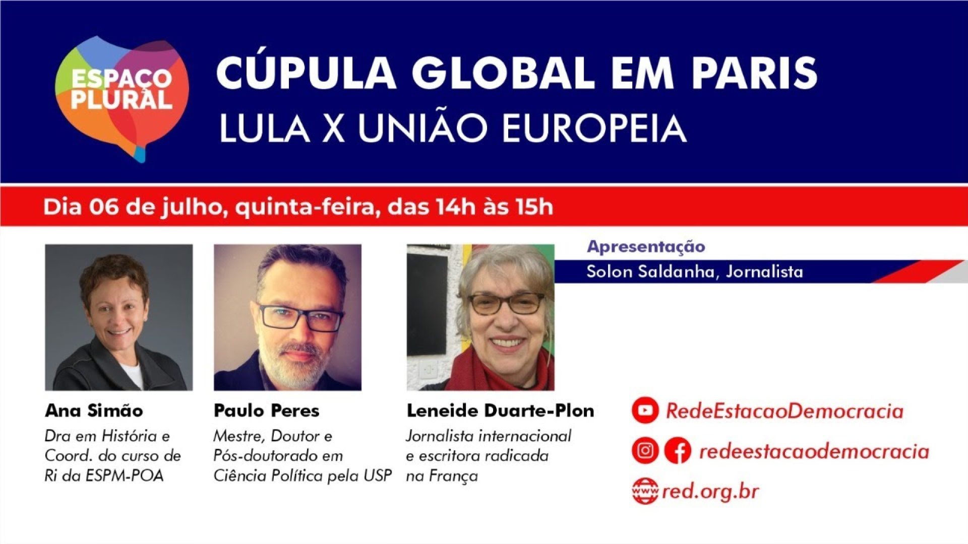 O programa Espaço Plural vai ao ar no YouTube e no Facebook de segunda à sexta-feira, a partir das 14h, com a apresentação do jornalista Solon Saldanha.