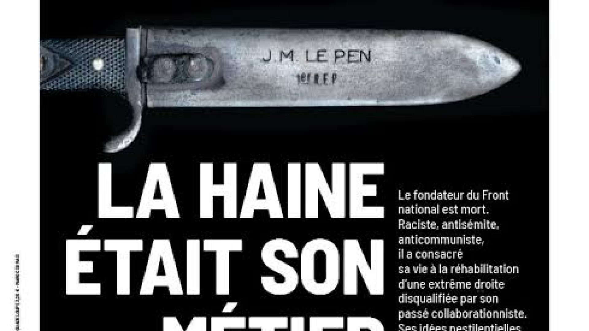 Foto: Capa do Le Humanité: O ÓDIO ERA SEU TRABALHO – O fundador da Frente nacional está morto. Racista, anti-semita, anticomunista, ele se dedicou sua vida para a reabilitação de uma extrema direita desqualificada por seu passado colaboracionista.